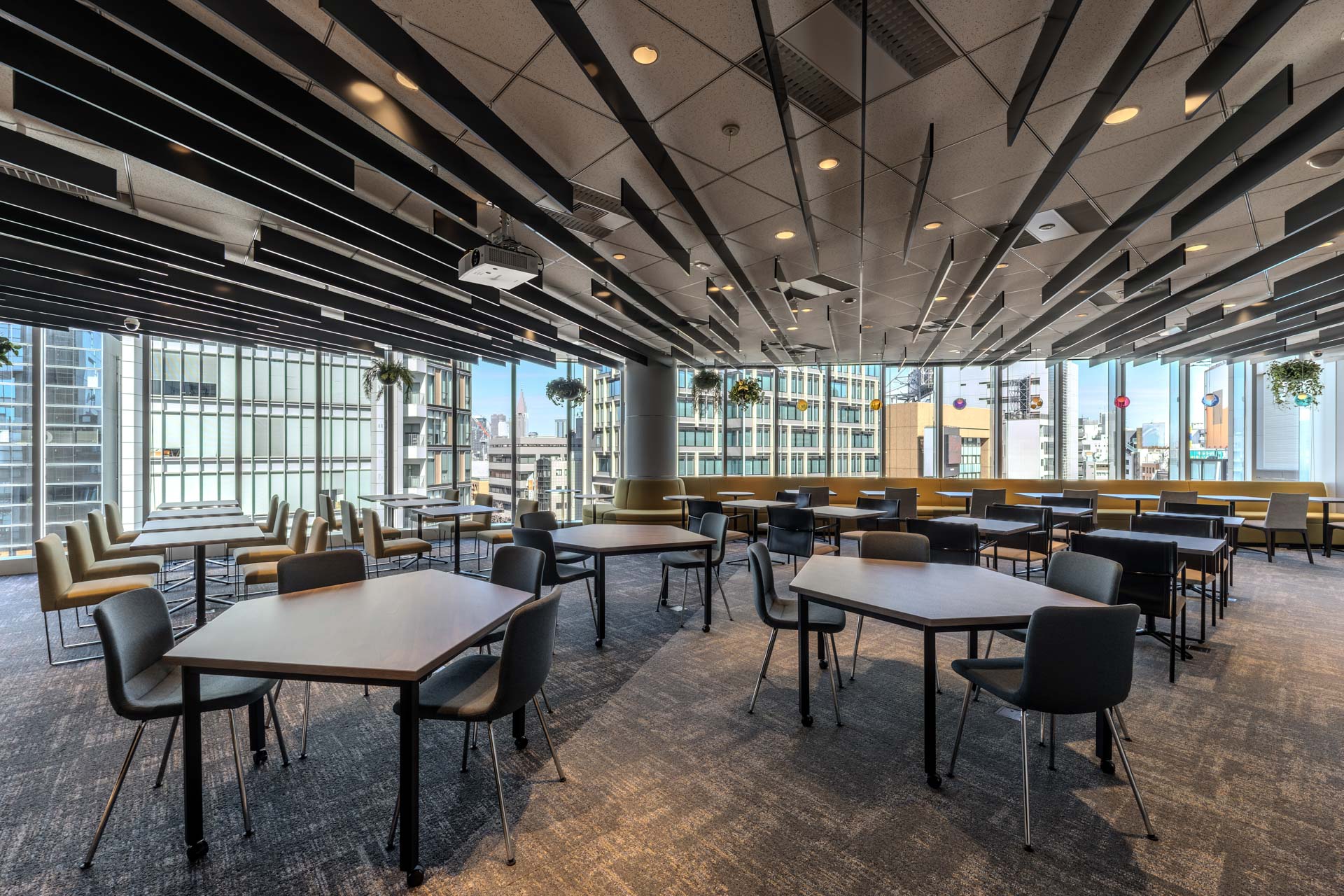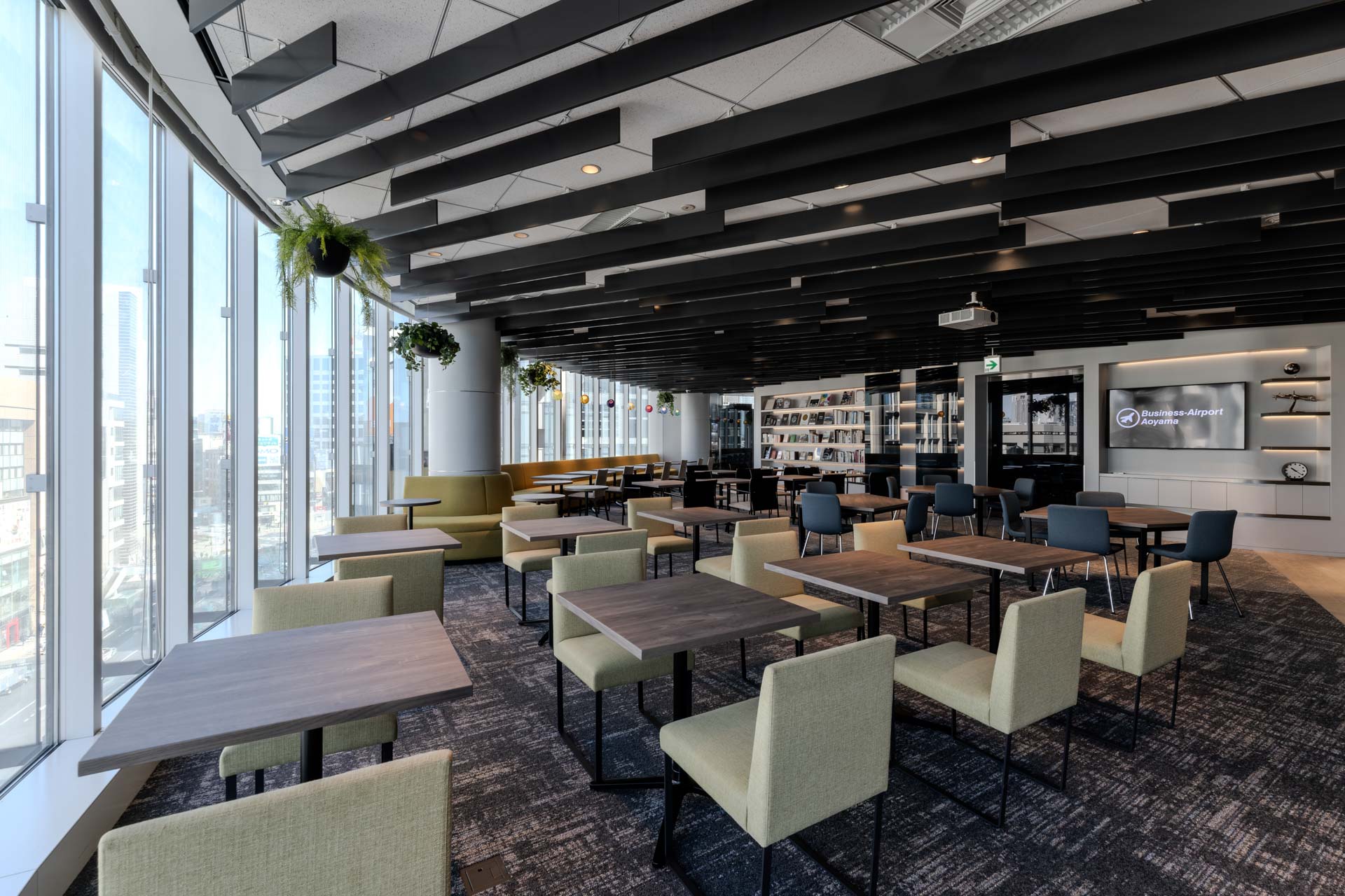 青山の華やかな街並みを一望できる窓に面したコワーキングスペースは、開放的な空間です。